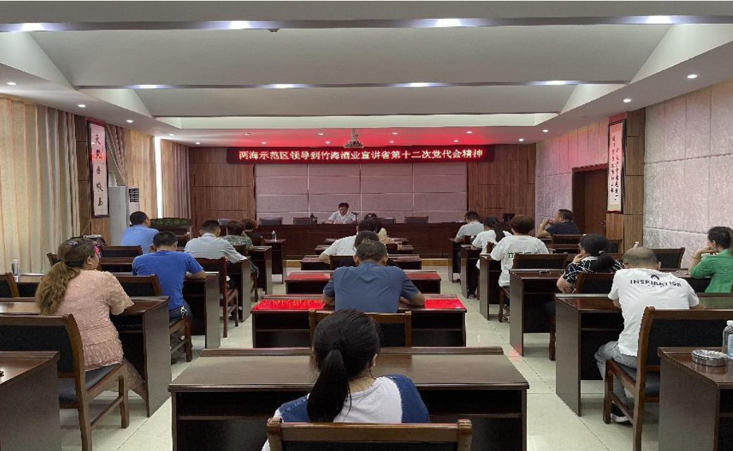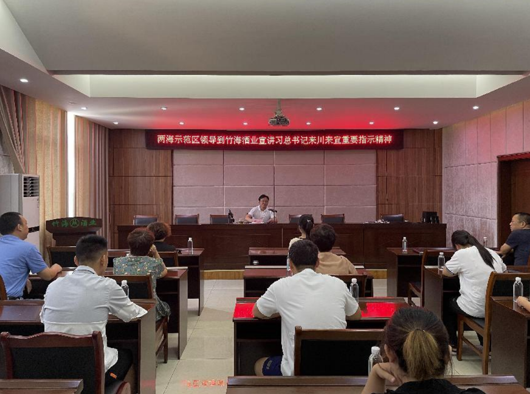 2022 年 7 月 29 日上午,“两海”示范区党委委员、副主任易炜到竹海酒业宣讲习近平总书记来川来宜考察重要讲话精神。宣讲会在企业办公楼 304 会议室举行,由公司副总经理许静主持,公司高中层领导和员工代表近 30 人参加聆听学习。