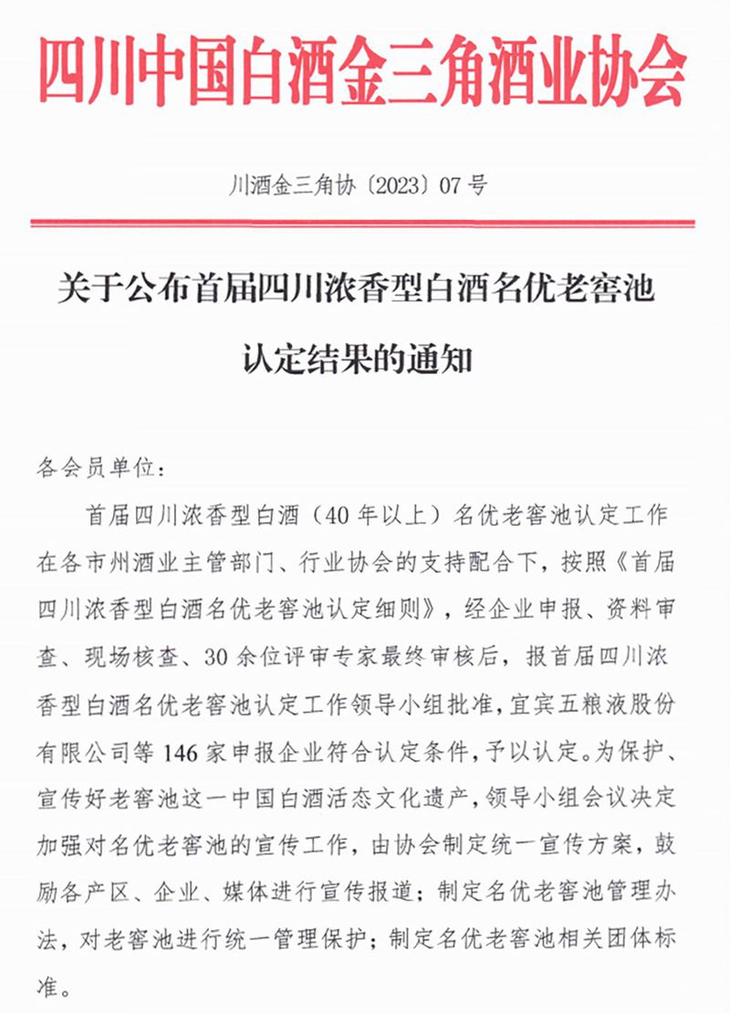 四川中国白酒金三角协会发布的文件中写到:“首届四川浓香型白酒(40年以上)名优老窖池认定工作在各市州酒业主管部门、行业协会的支持配合下,按照《首届四川浓香型白酒名优老窖池认定细则》,经企业申报、资料审查、现场核查、30余位评审专家最终审核后,报首届四川浓香型白酒名优老窖池认定工作领导小组批准……”