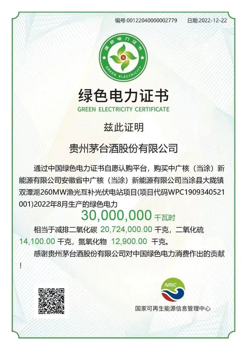 据悉,2023年,贵州茅台酒股份有限公司完成首单绿色电力市场化交易,绿电使用量将达1亿度,且实现绿色用电100%覆盖。据此核算,贵州茅台酒股份有限公司采购的绿电,将直接减少温室气体排放约9.4万吨二氧化碳当量,以平均每亩树林减排1.336吨二氧化碳折算,相当于植树7万亩。