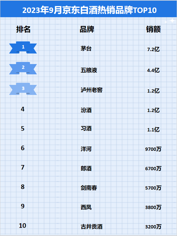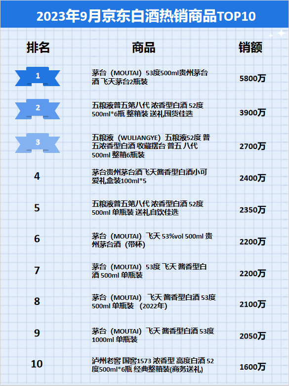 9月白酒市场的整体热度较高,贵州茅台先是与瑞幸联名推出酱香拿铁,后又宣布与德芙推出联名产品酒心巧克力,引起了诸多消费者的关注。在这一热度的加持下,从销售上看,9月白酒的销售表现也比较好。鲸参谋数据显示,9月份京东平台上白酒的月销量为290万+,环比8月增长48%;销售额为23亿+,环比8月增长51%。