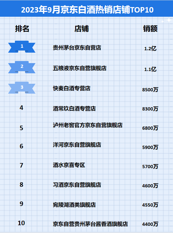 在热销店铺中,月销额破亿的店铺有贵州茅台京东自营店和五粮液京东自营旗舰店,两店铺的市占都在5%左右。受大盘上升的影响,热销TOP10店铺中,90%的店铺环比均呈正向增长。其中,酒常玖白酒专营店和洋河京东自营旗舰店的涨幅较大,销额环比增长分别约为105%和145%。