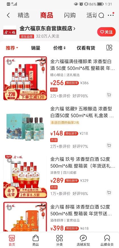 而伴随着餐饮消费需求的增长,白酒也收获颇丰。根据叮咚买菜数据显示,今年年货节期间,平台上白酒销量同比提升近180%,白酒热再次席卷春节。截止1月29日,京东平台上金六福酒、文君酒等自营旗舰店均有不俗销量和好评表现。
