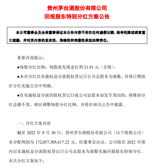 就在今年6月23日,贵州茅台发布《2021年年度权益分派实施公告》,每股向投资者派发现金红利21.675元,成为A股之最。而此次特别分红,每股将再派发红利21.91元,年内单股现金分红达到43.585元,再度刷新A股纪录。