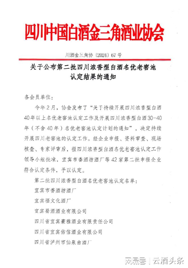 10月12日,四川中国白酒金三角协会发布“关于公布第二批四川浓香型白酒名优老窖池认定结果的通知”,宜宾市香酒坊酒厂等42家第二批申报企业符合认定条件,予以认定,名单如下(左右滑动查看更多,来源:四川中国白酒金三角酒业协会)。
