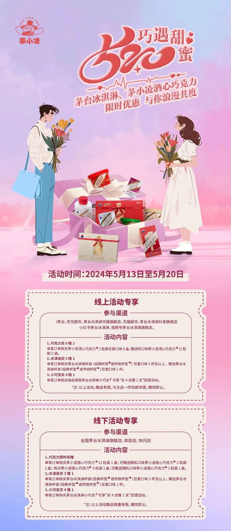 5月13日至5月20日,在指定线上活动渠道:i茅台APP、京东超市、茅台冰淇淋天猫旗舰店、天猫超市、茅台冰淇淋抖音旗舰店、小红书茅台冰淇淋、视频号茅台冰淇淋旗舰店购买茅台冰淇淋、茅小凌酒心巧克力达指定数量,可享受以下福利: