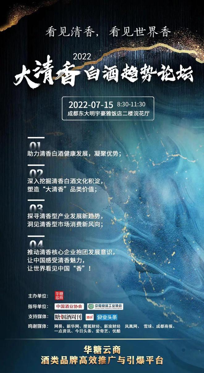 清香白酒作为国际香型,虽不乏诸如汾酒这样的超强明星和企业,但品牌丰度不足、品牌层级浅薄、产业规模仍具有较大提升空间。为提升大清香白酒产业价值,推动中国大清香白酒市场健康发展,深入分析大清香型白酒消费趋势与时代机遇,促进大清香品类高质量发展, 2022年全国(成都)春季糖酒会期间,华糖云商、糖烟酒周刊、酒说将联合权威机构,搭建清香白酒发展平台,举办“看见清香,看见世界香—— 2022中国大清香白酒趋势论坛”。