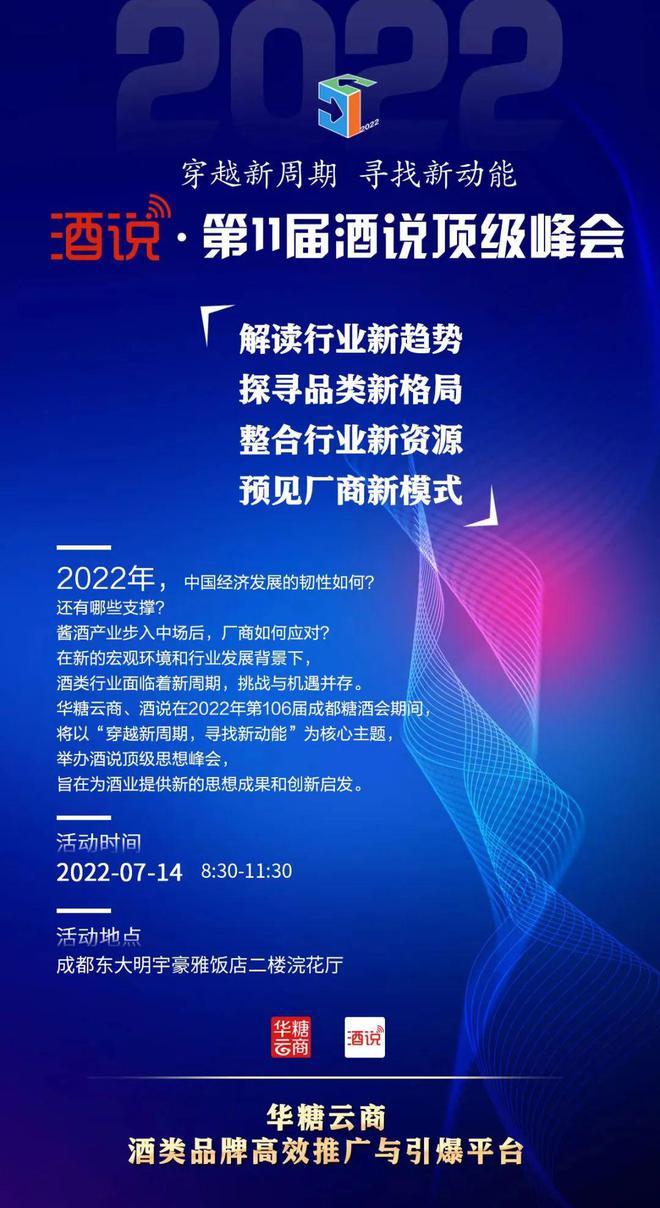 2022年时间过半,在这半年以及接下来的时间中,中国经济发展有哪些亮点及趋势?新的宏观环境和行业发展背景下,酒类行业面临着新周期,挑战与并存。华糖云商、酒说在2022年春季糖酒会期间,将以“穿越新周期 寻找新动能”为主题,举办2022酒说第11届酒业顶级思想峰会,旨在探讨酒业发展机遇和挑战,洞察市场新变化和消费新趋势,汇聚更大的酒业智慧和行业力量,为酒业提供新思想成果和创新启发。