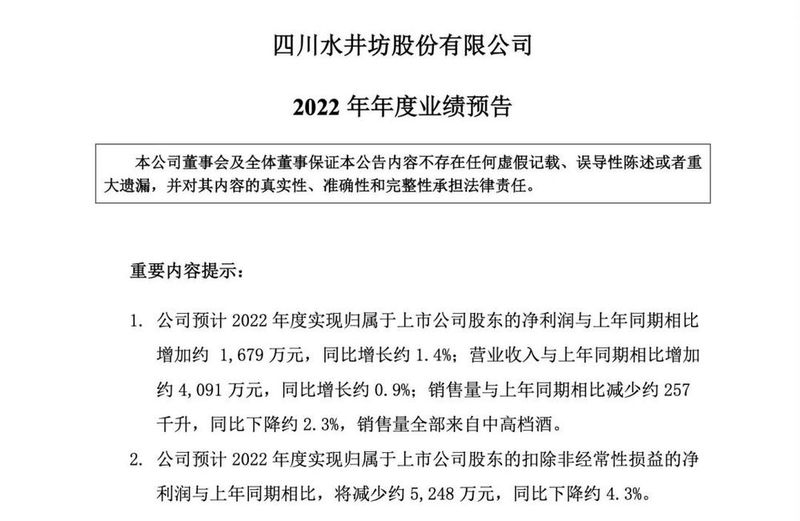 水井坊也实现了营收与利润的同步增长,但增幅相对较小。2022年水井坊营收预计比上年增加约4091万元,同比增长约0.9%;净利比上年同期增加1679万元,同比增长1.4%。不过,其扣非净利润出现了下降,与上年同期相比减少约5248万元,同比下降4.3%。水井坊给出的解释是:受疫情影响,消费需求与场景严重萎缩,渠道库存压力大,市场缩量竞争。