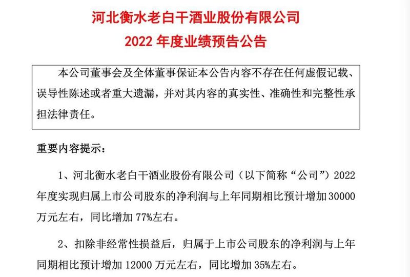 从增幅来看,营收体量长期处于腰部的老白干在本次业绩预报中脱颖而出。2022年,老白干预计实现归母净利润6.9亿元左右,同比增加77%。本次业绩预增,老白干将其归为2022年不断优化产品结构、深化市场建设下主营业务收入提升的成效。