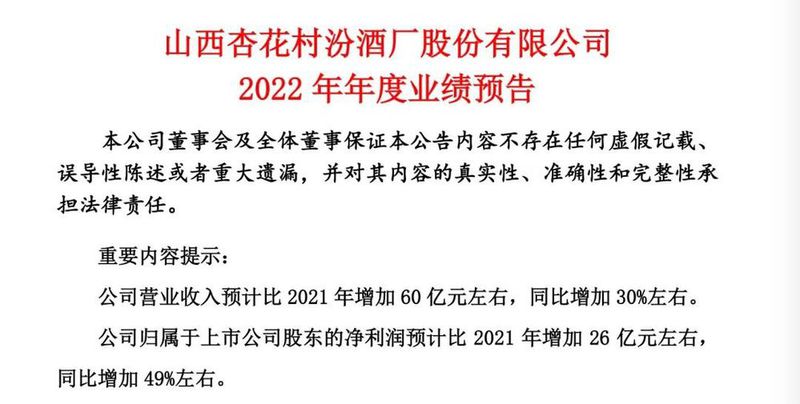 增幅同样可观的还有处于第二梯队领跑者位置的山西汾酒。2022年,汾酒预计实现营业收入260亿元左右,同比增加30%;归母净利润预计实现79亿元左右,同比增加49%。其中,青花汾酒全系列同比增长达60%。汾酒将业绩预增归功为2022年深度拓展市场、深耕终端、深化市场结构与产品结构。据其介绍,目前汾酒可掌控的终端数量已突破112万家,长江以南市场实现了稳定突破,同比增长超过50%。