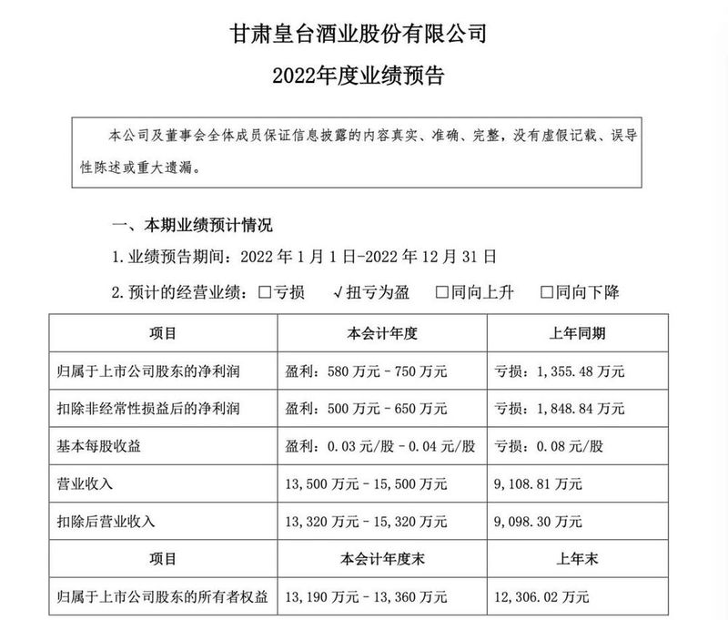 值得关注的是,尾部企业*ST皇台也传来喜报。2022年,*ST皇台预计实现归母净利润580-750万元,而2021年*ST皇台还陷入亏损境地,上年同期亏损1355.48万元。本期扭亏为盈得益于*ST皇台大力开拓经销与直售渠道、持续优化产品结构、开拓市场新需求。2022年主要产品窖底原浆系列、普老皇台、醉凉州销量实现较大增幅。