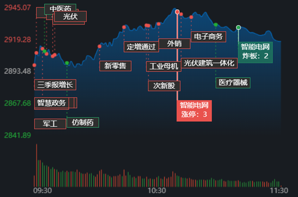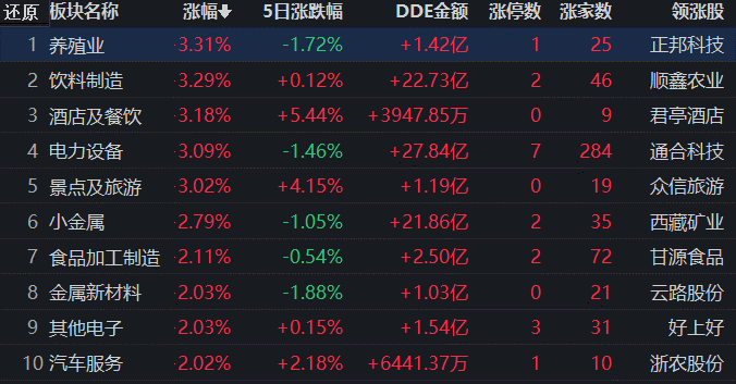 同花顺行业方面,截至11月1日11:30,76类行业中65类上涨,占比85.53%,其中,养殖业、饮料制造、酒店及餐饮、电力设备、景点及旅游等行业涨幅居前,均超3%。下跌的行业中,医疗器械居首,跌幅达1.63%。