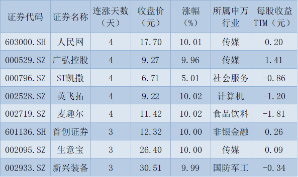 表:连续上涨3日且今日收盘涨停股一览