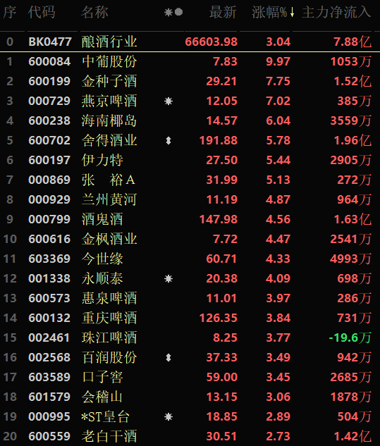 从早盘表现强势的酿酒行业看,交易中的40只成份股有37只上涨,其中,中葡股份封涨停板,另有6只个股涨超5%。资金流向看,该行业大单资金净流入额为7.88亿元,居行业第2位。