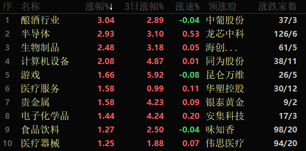 东方财富行业方面,截至2月2日11:30,86类行业中59类上涨,占比68.60%,其中,酿酒行业涨幅居首,达3.04%;此外,半导体、生物制品、计算机设备等行业涨幅也超过2%。下跌方面,教育行业跌幅居首,达2.23%;此外,航天航空和多元金融跌幅也均超1%。