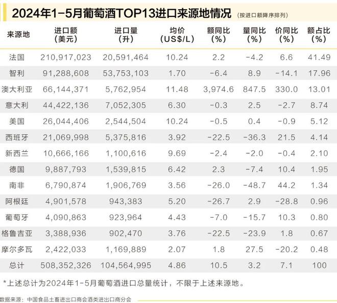 统计数据显示,2024年1-5月,我国从澳大利亚共进口葡萄酒576万升,涨幅高达847.5%;进口额6614万美元,同比暴增3974.6%。