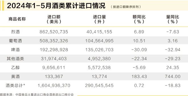 近日,中国食品土畜进出口商会酒类进出口商分会发布了《2024年1-5月酒类进出口情况》。总体来看,今年1-5月,进口酒呈现出继续向好的态势,进口总额接近16.05亿美元,止跌微增0.72%,较前4个月跌幅回升近6个百分点;进口总量超过2.9亿升,虽然同比下滑18.83%,但跌幅已趋于稳定,展现出市场的韧性。