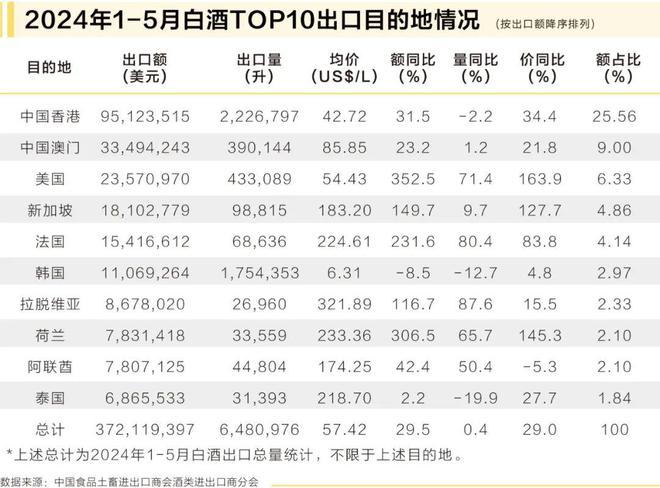 在全球75个不同的目的地市场中,中国香港是白酒出口的第一大市场,平均每升出口价格为42.72美元,贡献了9512.4万美元的出口额,出口量达到222.7万升,呈现出价额扩增,数量缓降的趋势;中国澳门作为第二大出口地,迎来量额双重反弹,出口额达到3349万美元,出口量39万升,平均每升85.85美元,价格大幅提速;再者,美国作为第三大出口目的地,白酒的出口量、价、额均保持强劲增长。