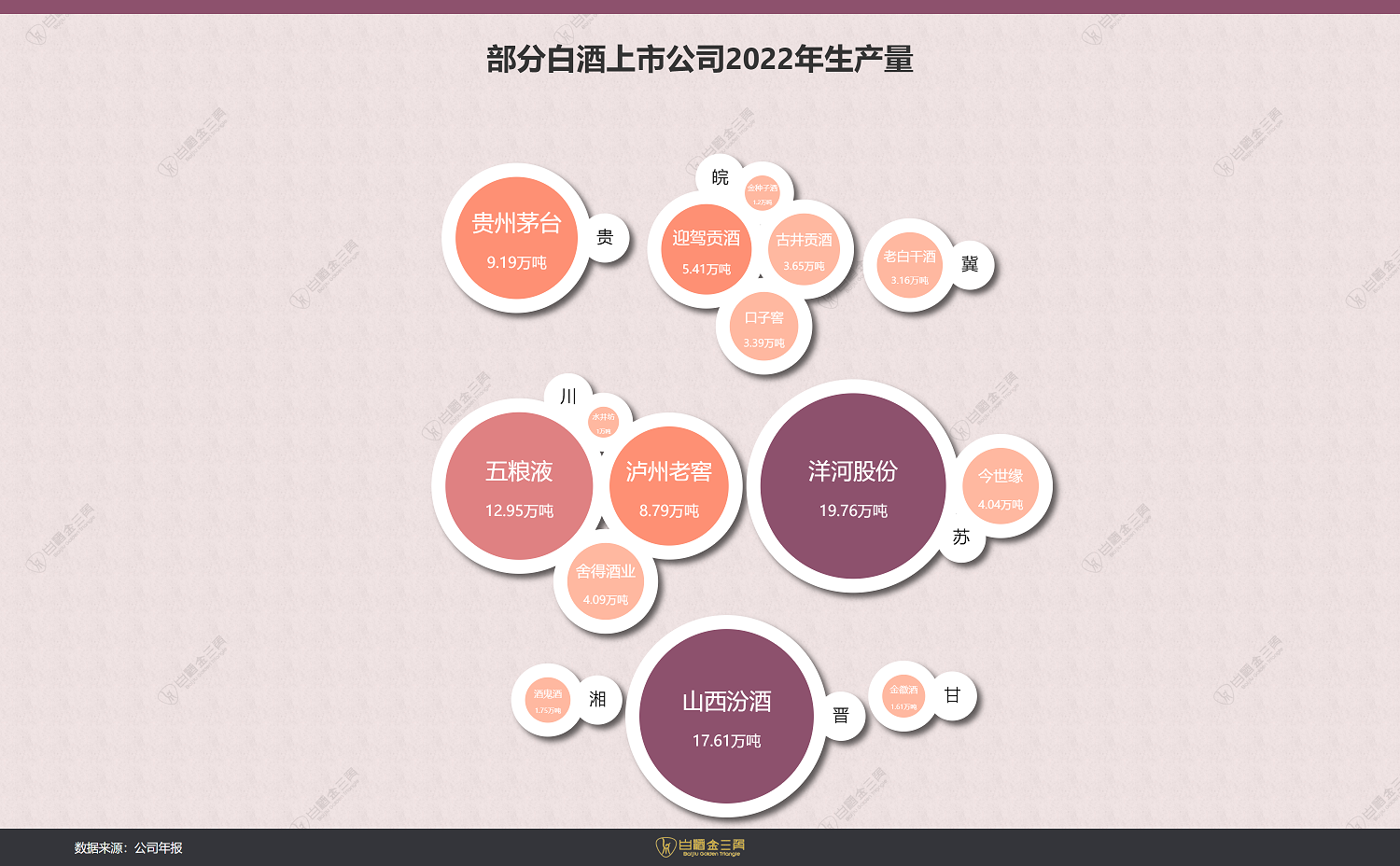 产量排名前3的上市企业是:洋河股份19.76万吨、山西汾酒17.61万吨、五粮液12.93万吨。