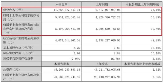 报告显示,上半年泸州老窖实现营业收入116.64亿元,同比增长25.19%;实现归属于上市公司股东的净利润55.32亿元,同比增长30.89%。