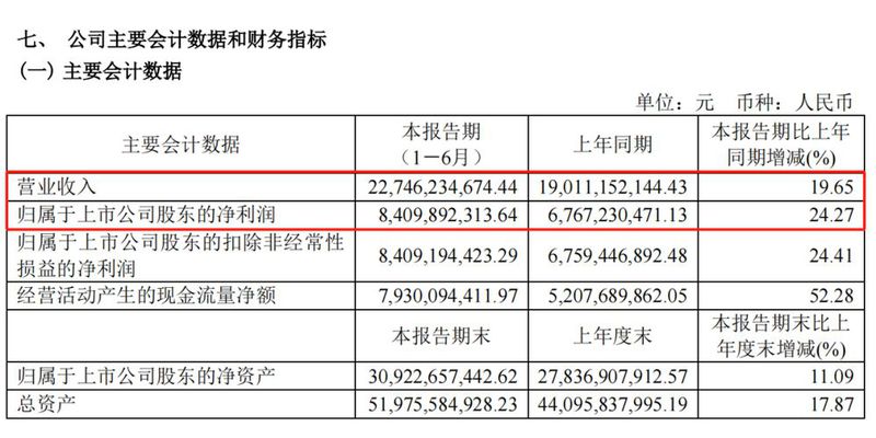 8月27日下午,山西汾酒披露了2024年半年度报告,报告显示:今年上半年,汾酒首次突破200亿关卡,实现营业收入227.46亿元,同比增长19.65%;净利润84.1亿元,同比增长24.27%。其中,在第二季度汾酒继续保持两位数增长,实现营收74.08亿元,同比增长17.06%;归母净利润21.47亿元,同比增长10.23%。