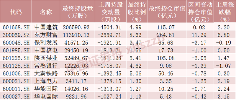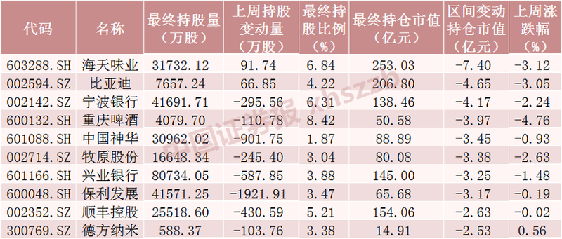 持仓市值减少额居前十的股票中除海天味业、比亚迪被北向资金分别加仓91.74万股、66.85万股外,其他股票均被北向资金减仓,其中保利发展被北向资金减仓超1900万股。