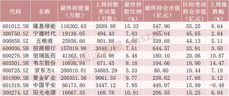 北向资金持仓市值增加额居前十的股票均被北向资金加仓,其中对隆基绿能、招商银行、京东方A、紫金矿业、中国平安的持股增加数超2000万股,显示了北向资金大幅加仓A股核心资产。