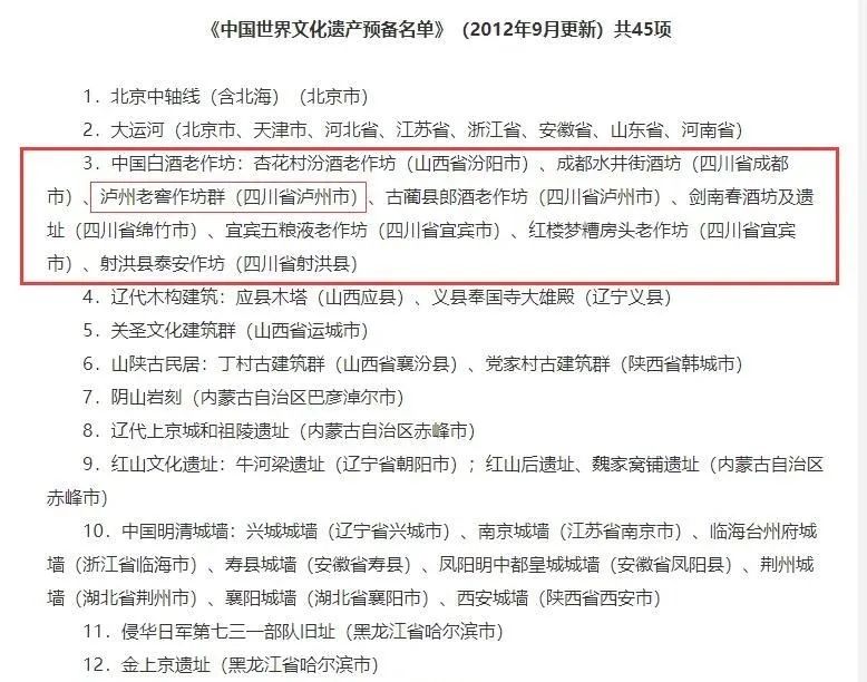 而早在2006年12 月,泸州老窖大曲老窖池群、刘伶醉烧锅遗址、李渡烧酒作坊遗址、水井街酒坊遗址、剑南春天益老号酒坊遗址等酿酒行业4处全国重点文物保护单位,便以“中国白酒酿造古遗址”的项目,被国家文物局捆绑列入中国“申报世界文化遗产预备名单”(35项文化遗产),泸州老窖被其余四家推选为组长单位。