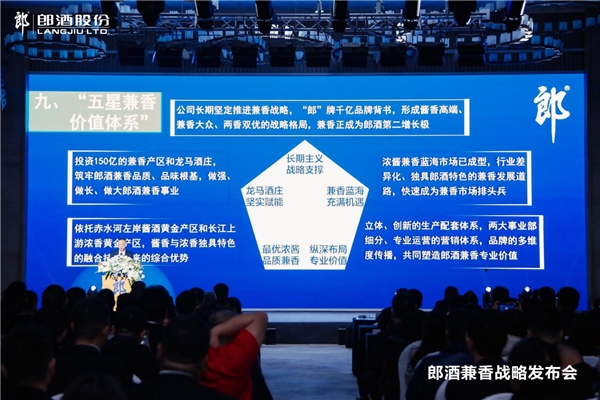 2月8日,“郎酒兼香战略发布会”在赤水河左岸郎酒庄园盛大举行,宣告郎酒正式开启“酱香高端、兼香大众、两香双优”的战略格局。郎酒表示,将用未来2—3年的时间,实现郎酒兼香100亿元年营销规模,将之做成浓酱兼香市场第一和大众喜爱产品。