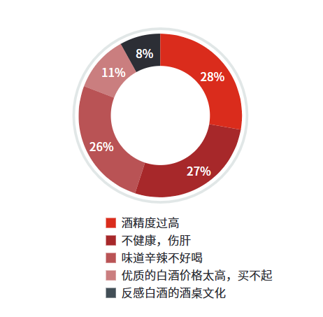 根据《年轻人的酒一一中国酒类品类创新研究报告》得知,酒精度过高、不健康且味道辛辣不好喝是年轻人抗拒白酒最主要的三大障碍,而被年轻人时常批判的酒桌文化在年轻人不适合喝白酒原因中占比仅为8%,所以要增强白酒与年轻人的互动首先还是要从度数、口味等方向,为其开发适合年轻人饮用的白酒产品。在近期举办的中国浓香名酒高质量发展论坛中,中国酒业协会理事长宋书玉也指出,更低的酒度、更好的风味才是白酒发展的方向。