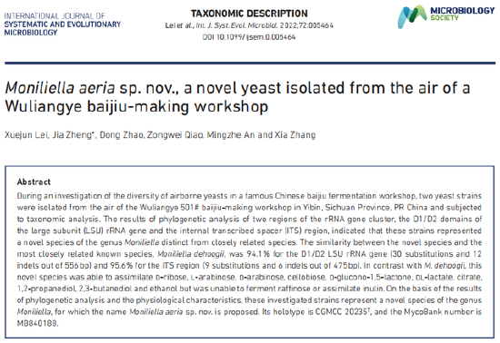 2022年8月,五粮液科研团队首次在501酿酒车间古窖池群生态环境中分离出一株酵母菌全新菌种,编号为WLY-L-M-1,命名为空气丛梗孢酵母(Moniliella aeria)。该新菌种的微生物分类学研究论文《Moniliella aeria sp. nov., a novel yeast isolated from the air of a Wuliangye baijiu-making workshop》(分离于五粮液酿造环境中的空气丛梗孢酵母新菌种)在国际微生物分类学权威杂志《International Journal of Systematic and Evolutionary Microbiology》(国际系统与进化微生物学杂志)公开发表,为中国白酒酿造微生物及代谢机理研究提供了重要参考。