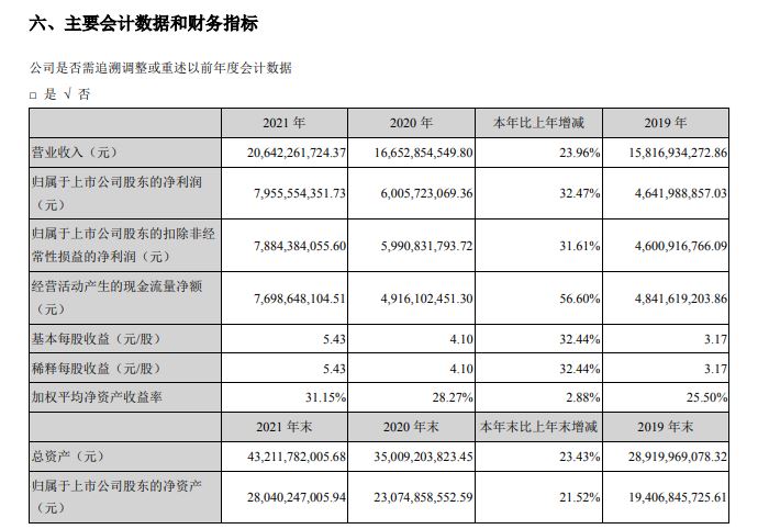 4月28日下午,泸州老窖股份有限公司发布2021年年度报告。报告显示, 泸州老窖2021年度实现营业收入206.42亿元,同比增长23.96%;实现归属于上市公司股东的净利润79.56亿元,同比增长32.47% 。比之前业绩快报所披露的数据增幅更高。