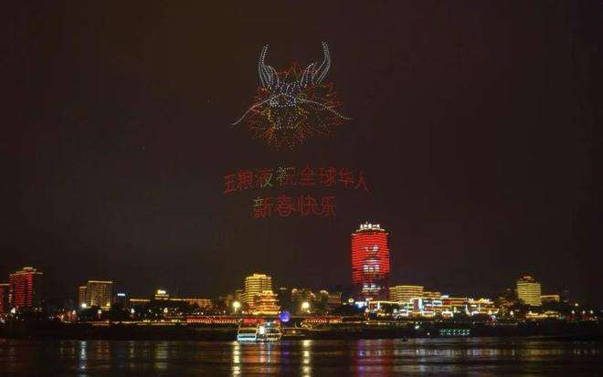 此次无人机秀的主题部分,除了加入五粮液的标志性元素外,还融入了喜迎新春的祝愿。随着甲辰祥龙、幸运福袋、美丽中国结等10余个绚丽图形依次“登陆”合江门夜空,五粮液也向家乡人民送上了一份恭贺新春佳节的和美祝福。这一场近二十分钟的视觉盛宴,也引来现场阵阵轰动热潮,市民、游客们纷纷驻足观看、拍照和录制视频。