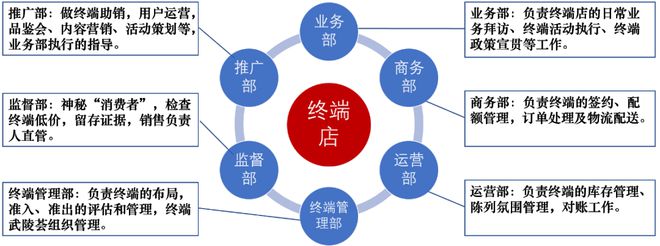对于区域型酒企,发育中央的组织能力,销售组织配合和执行即可,例如武陵酒业在业务上六个部门服务于一个核心烟酒店,大部分的部门都是总部部门,协同区域业务共同完成对烟酒店的服务和赋能。