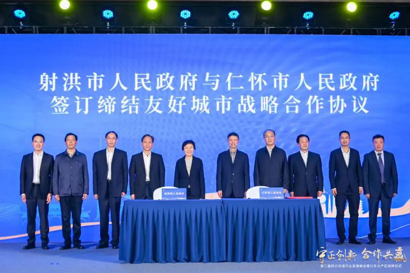 活动现场,射洪市人民政府与仁怀市人民政府签订了友好合作的协议。从白酒产业层面看,这是一次“浓酱携手”的标志事件和跨越香型互动的开创之举。两地深化合作、取长补短必将产生新的化学反应,促进白酒行业在竞合中良性发展。