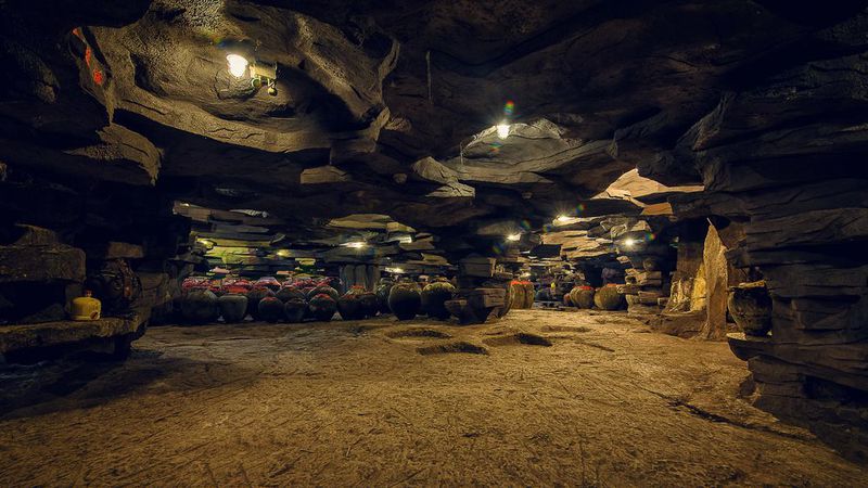 一个个酒坛静静排列,酒坛上满布着厚厚的“酒苔”,酒坛阵列的一角,叮叮咚咚的流水声带来丝丝凉意。这里便是位于沈子国酒庄的地下藏酒洞。