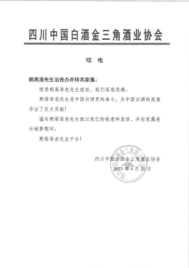 四川中国白酒金三角酒业协会发唁电沉痛悼念赖高淮先生
