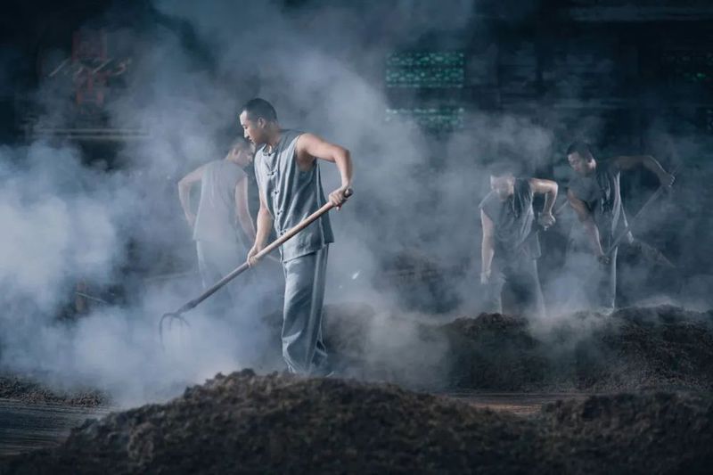 ▲ 酿酒拌糟,就是在发酵好的酒糟中,加上新鲜的粮食和糠壳,拌粮拌糠各两次,必须要做到低挖快拌,糟醅疏松适宜。拌糟不好,不仅会影响到本次蒸酒的出酒率,而且还会影响到以后多个轮次入窖发酵水平。