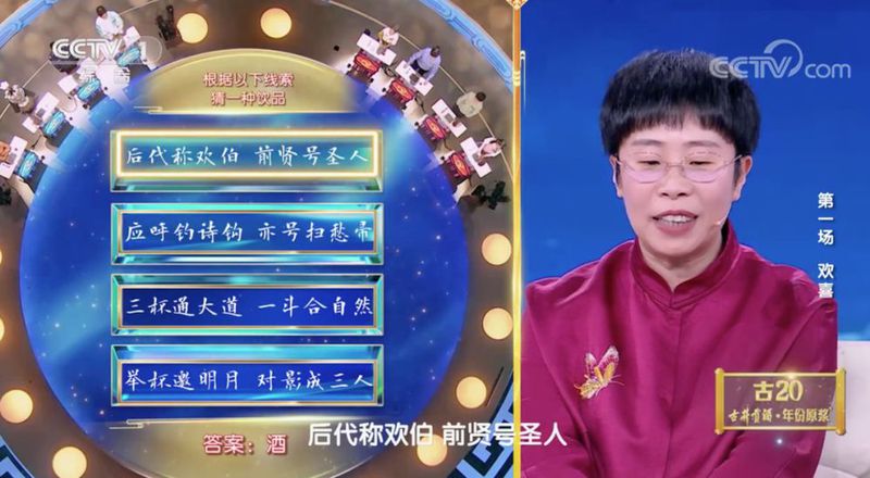 在首期节目中,有一道很有意思的题目,需要参赛选手根据“后代称欢伯,前贤号圣人”“应呼钓诗钩,亦号扫愁帚”“三杯通大道,一斗合自然”“举杯邀明月,对影成三人”等四句诗句线索,猜出一种饮品。