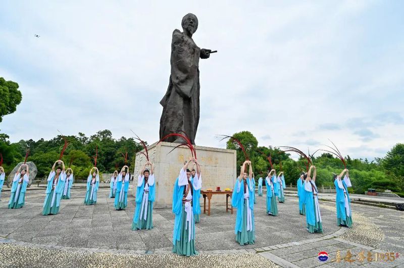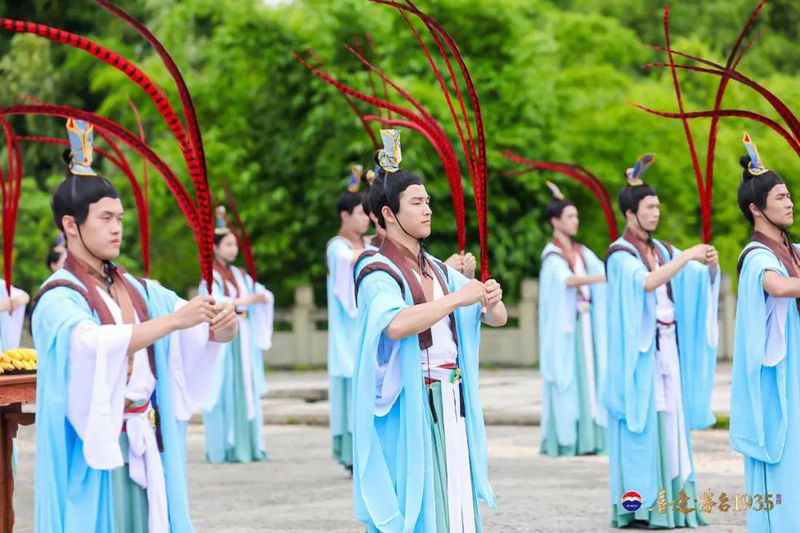 “千古一圣,先生阳明。寰宇所钦,四海共敬。”下午14时57分,在王阳明先生雕像处以一首司礼诵拉开了“喜逢·茅台1935”的序幕。随后围绕雕像,儒生手持睢尾,仪式舞蹈,嘉宾敬献花篮美酒,表达文化薪传、以酒载道、礼敬先贤之意。