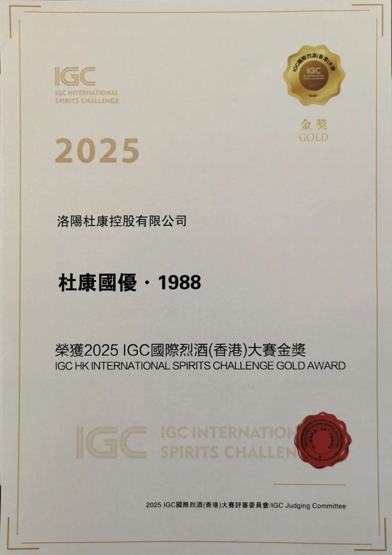 在全球烈酒行业的目光聚焦中,洛阳杜康控股核心产品杜康酒·国优1988,荣膺2025 IGC国际烈酒(香港)大赛金奖。