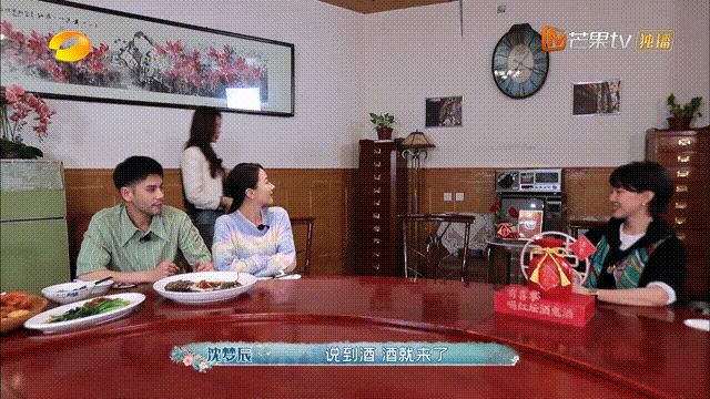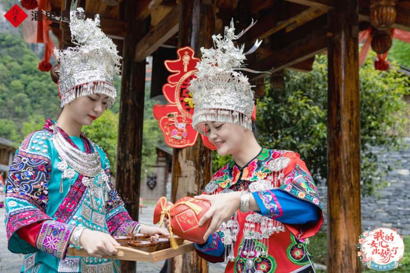 饮尽拦门酒后新人双方的亲友们即兴对歌,用嘹亮的山歌祝福新人婚后生活过得有声有色,拦门酒的古老婚俗与苗族特色长桌宴,为观众呈现了婚礼背后长辈深沉的爱意、新人对家庭的向往以及亲朋好友的祝福。