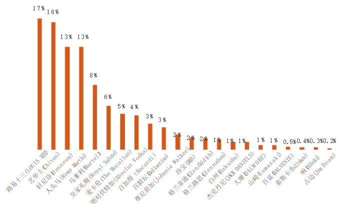 在洋酒选择上,17%的受访者首选“路易十三”,“芝华士”紧随其后,以16%的微弱差距排名第二。这两个品牌可以看成是洋酒品牌的第一梯队。第二梯队为“轩尼诗”和“人头马”,这两个品牌均获得受访者13%的投票。“马爹利”“皇家礼炮”和“麦卡伦”为第三梯队,分别获得6%、5%消费者的青睐。