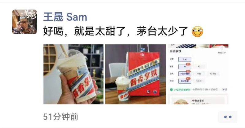 近日,茅台与瑞幸咖啡联名推出酱香拿铁咖啡,一经推出便迅速破圈。不少非酒业人士也纷纷在朋友圈晒出产品打卡照,其中还有不少是关注人工智能、医疗健康等领域的投资人,如英诺天使基金合伙人王晟。不只是咖啡,白酒在他们朋友圈中露脸的次数也渐渐多了起来。