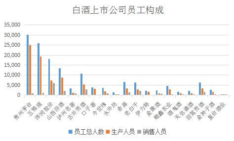 这三家企业的在职员工人数都超过了一万人。我们知道,除了洋河的销售人数在六千人以上,白酒上市公司的销售人员基本都在几百到两千人不等。在其他人员相差不大的情况下,上述企业的员工人数可以超过一万人,主要是因为生产人员数量较为庞大。2021年,上述企业的产量分别为20.2万吨、17.3万吨和11万吨,与生产人数基本相合。