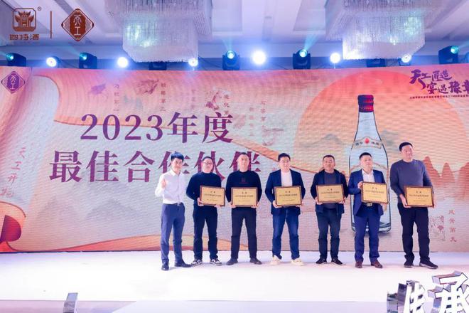 在热烈的掌声中,四特酒有限责任公司天工事业部总经理林洪谦、南昌市众信商贸总经理陈林等领导代表上台,共同见证了众信商贸年度答谢晚宴暨四特天工1988新品鉴赏会启动仪式!随着一阵阵欢呼声,天工1988作为晚宴的定制奖品开启现场抽奖环节,幸运送出,酒香传递,天工文化自此流传更远。随后,南昌市众信商贸总经理陈林为2023年度最佳合作伙伴颁奖并赠送好礼······举杯欢庆,笑语满堂,天工1988新品鉴赏会至此落幕。