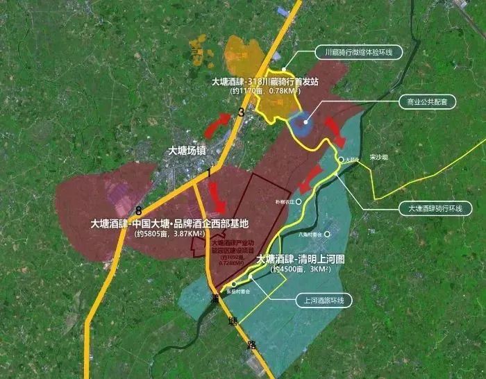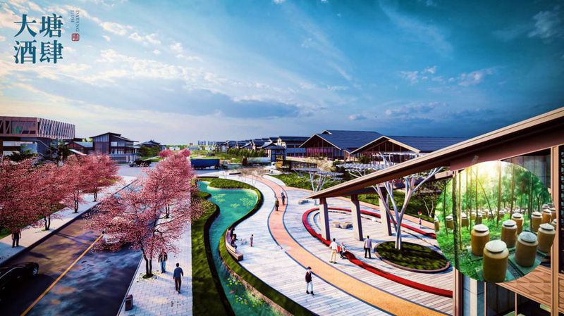 大塘酒肆项目包含中国大塘·品牌酒企西部基地、318川藏骑行首发站、清明上河图三个板块,规划面积7.65万平方公里。