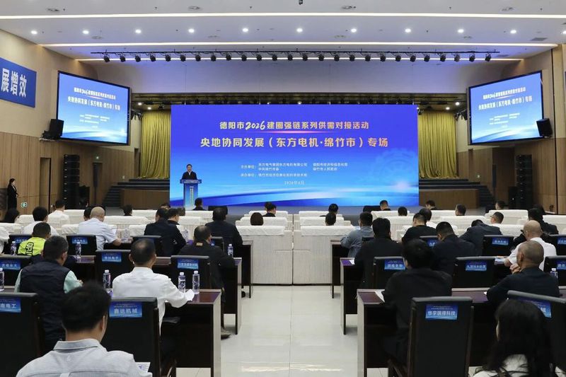 4月27日下午,德阳市2026建圈强链系列供需对接活动央地协同发展(东方电机·绵竹市)专场在绵竹市举行。市委副书记、市长黄朝阳,东方电气集团东方电机有限公司党委副书记、总经理张天鹏出席并致辞。