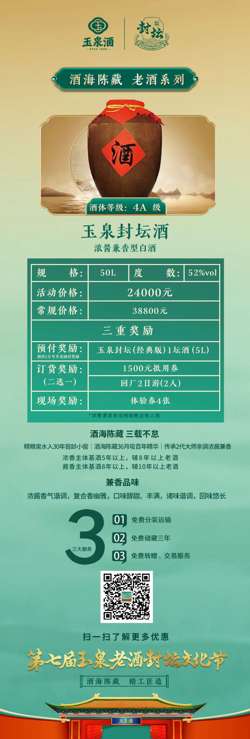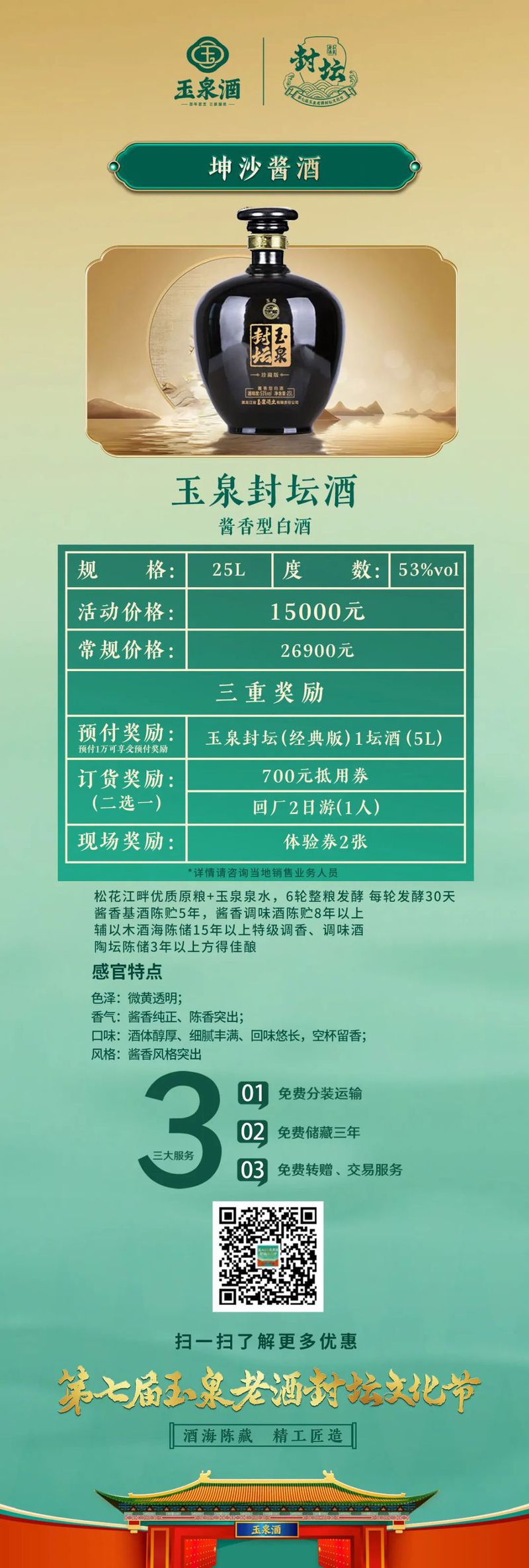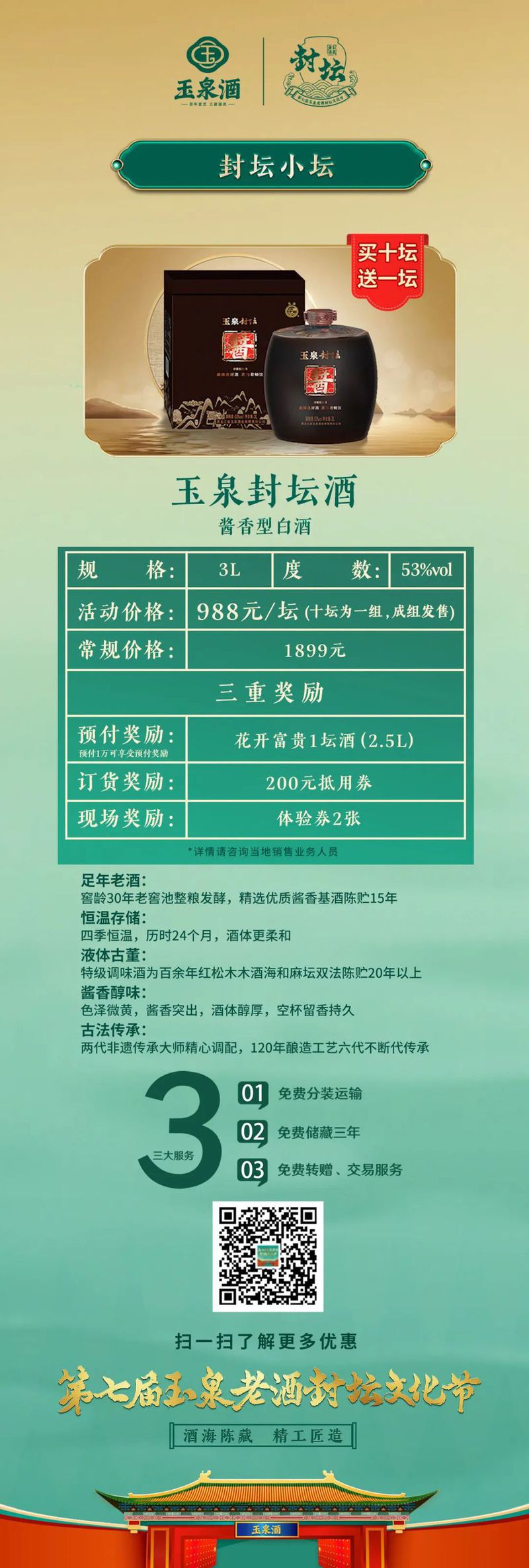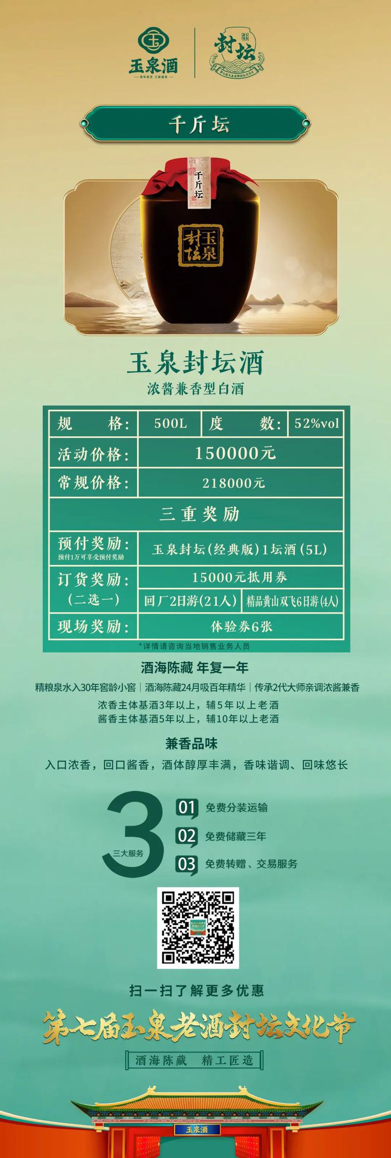 7月26日,玉泉酒业对本次封坛酒发起了为期一个月的预售,其中包括千斤顶、玉泉封坛酒(5A级、4A级)等,历经四季时光淬炼,成为展现玉泉酒浓酱兼香风格的绝世佳作,并提供免费分装运输、免费储藏三年、免费转增和交易等贴心服务。