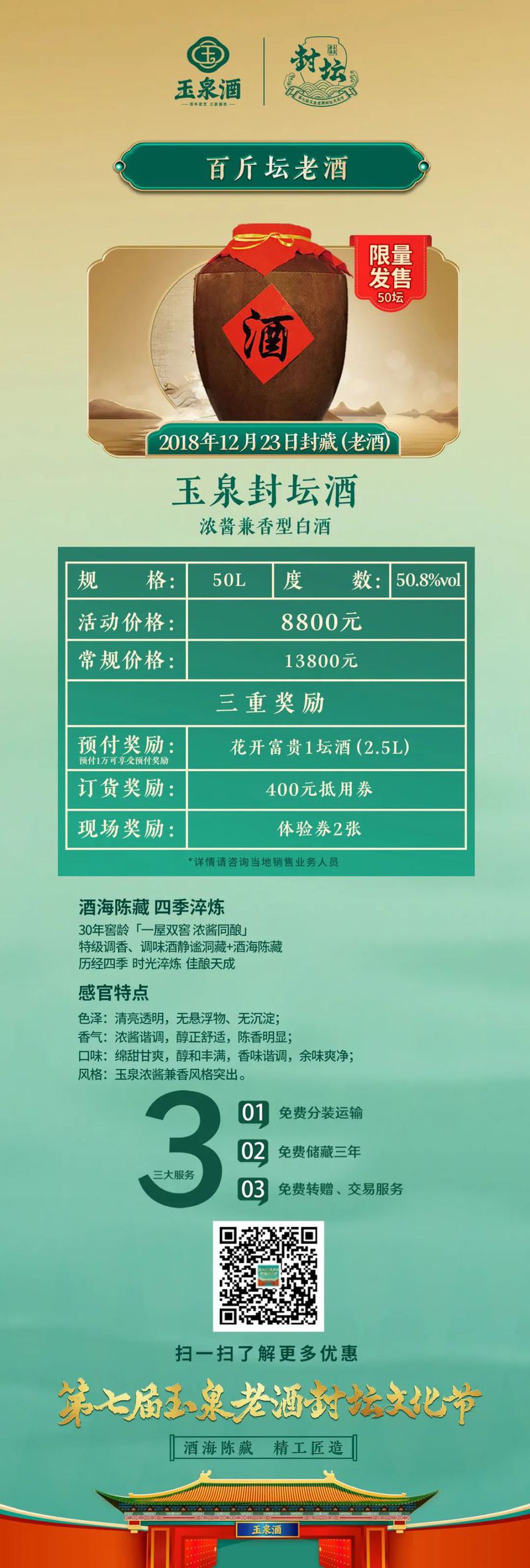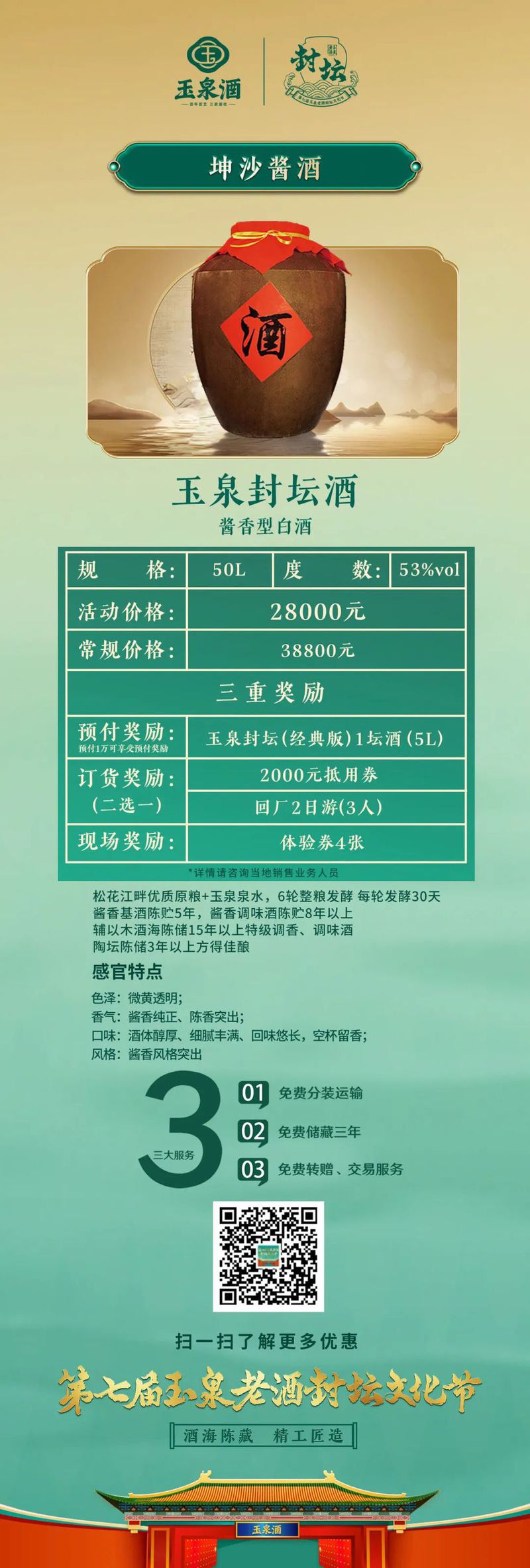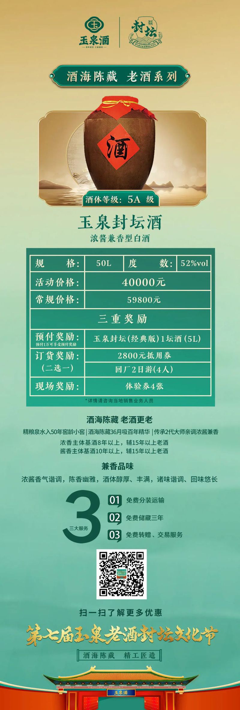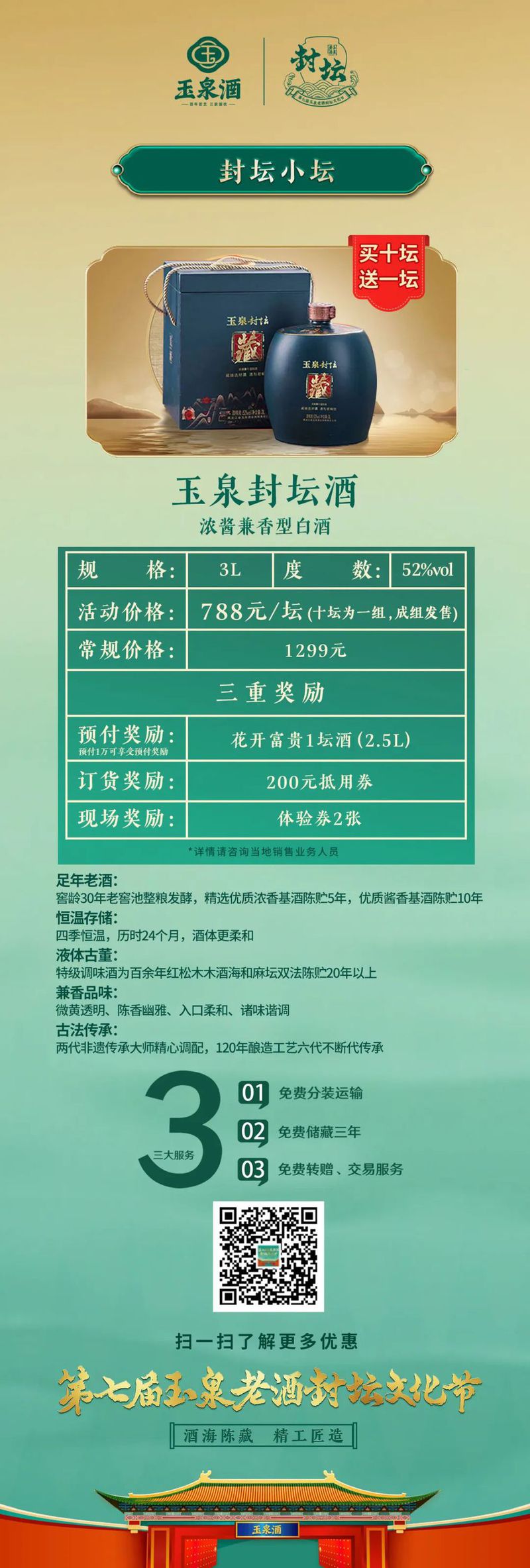 7月26日,玉泉酒业对本次封坛酒发起了为期一个月的预售,其中包括千斤顶、玉泉封坛酒(5A级、4A级)等,历经四季时光淬炼,成为展现玉泉酒浓酱兼香风格的绝世佳作,并提供免费分装运输、免费储藏三年、免费转增和交易等贴心服务。